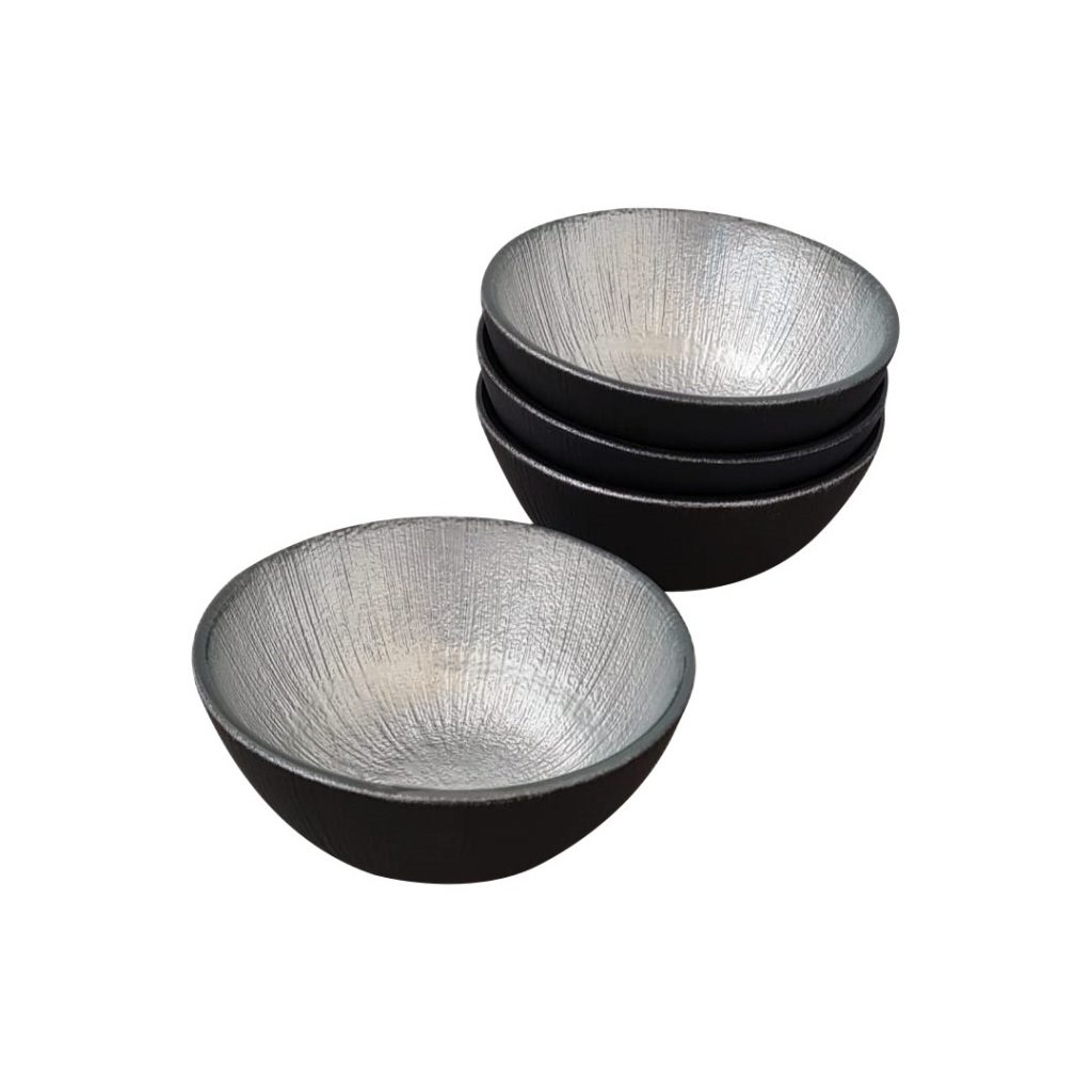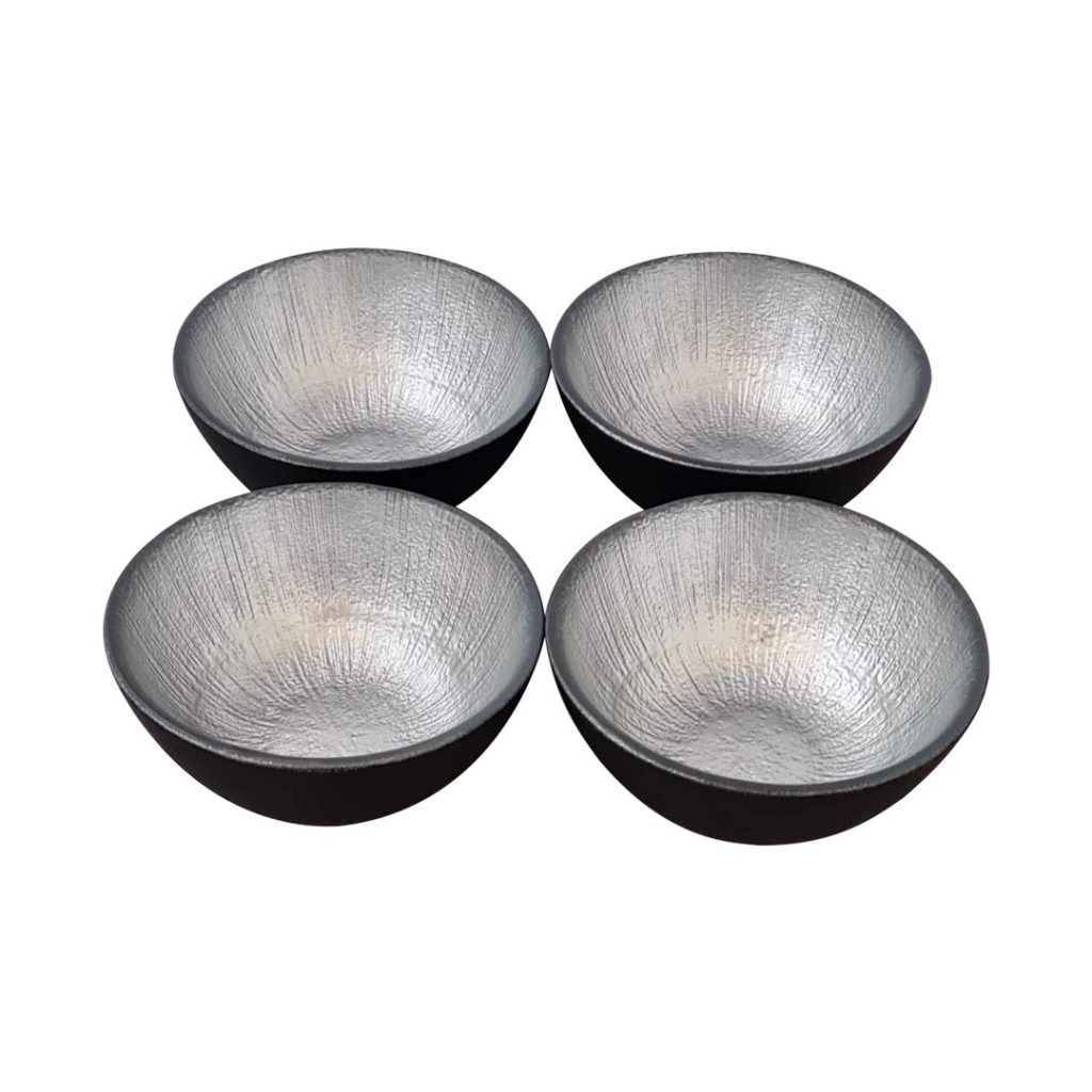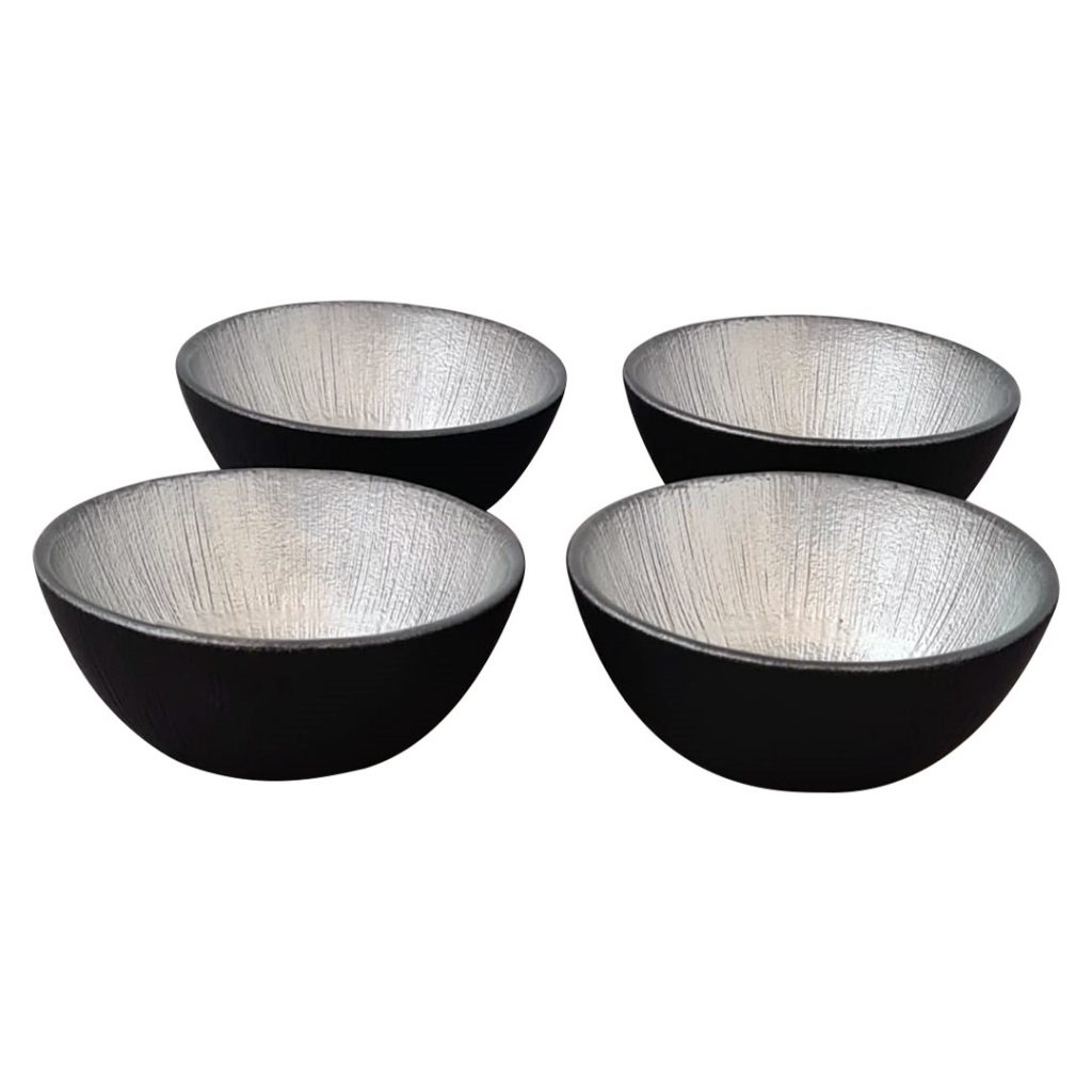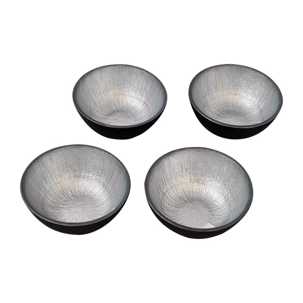 4 adet gümüş ve siyah detaylı cam çerezlik/kase seti