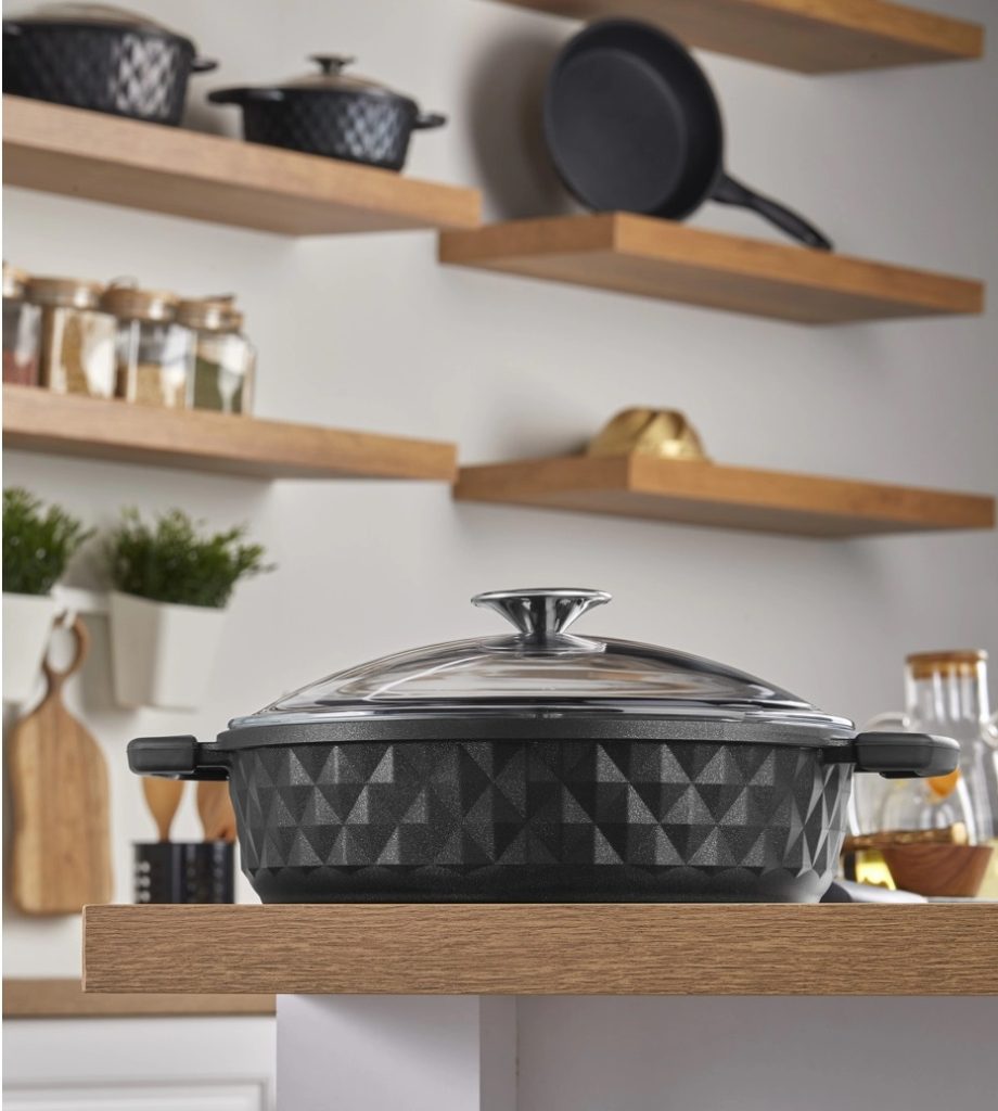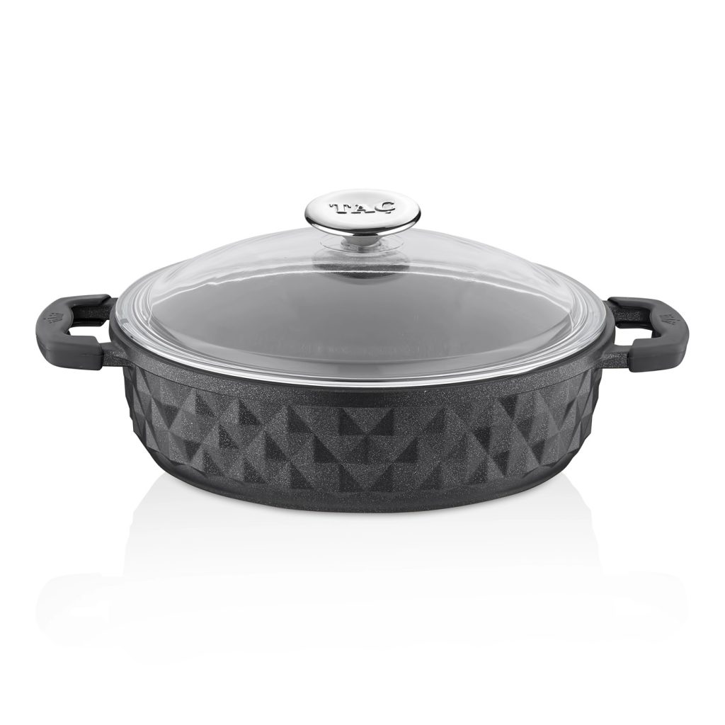 1 Adet cam kapaklı 26 cm sığ döküm tencere.