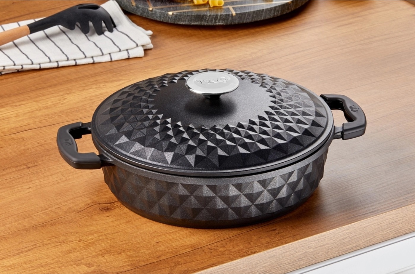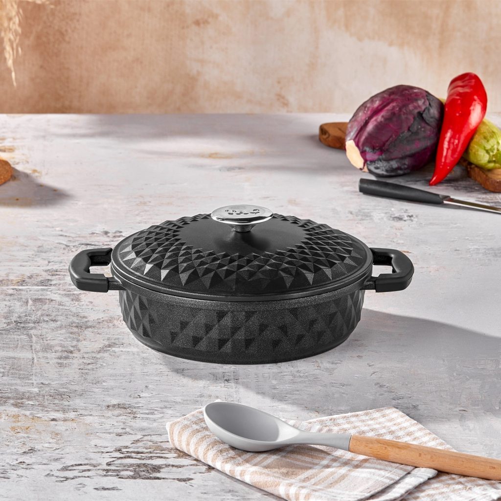 1 Adet döküm kapaklı 26 cm sığ döküm tencere.