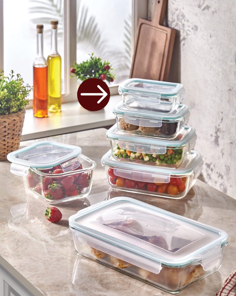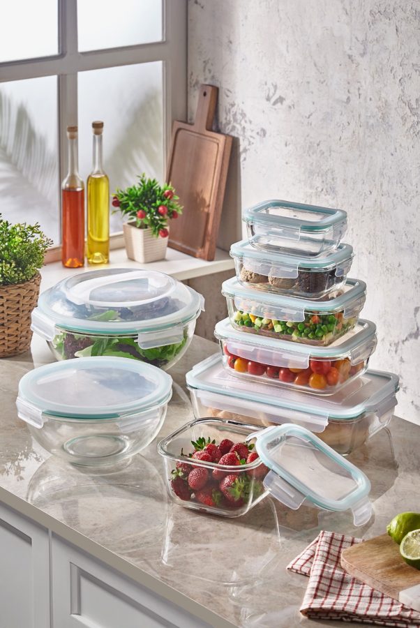 1 Adet kilitli kapaklı 370 ml cam hazneli saklama kabı.