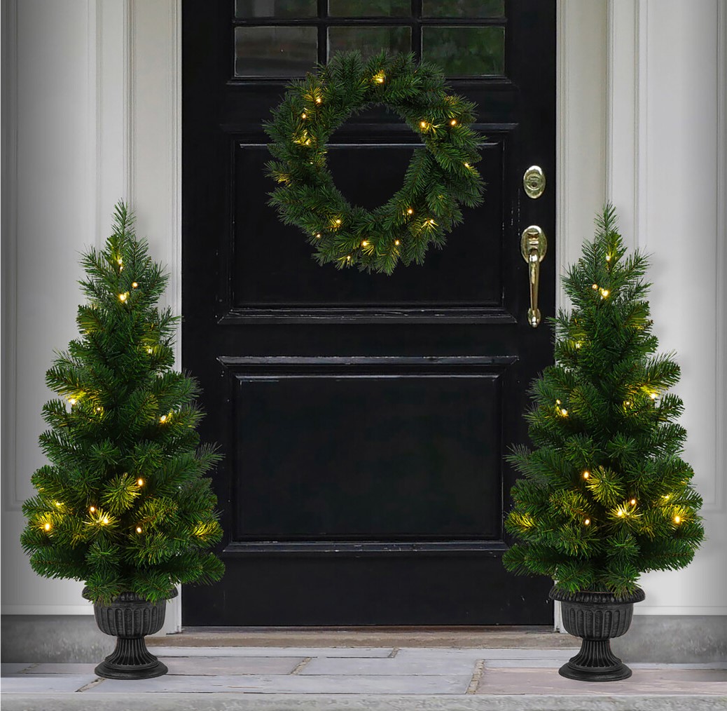 Led ışıklı 2 adet dekoratif çam ağacı ve 1 adet kapı çelengi set.